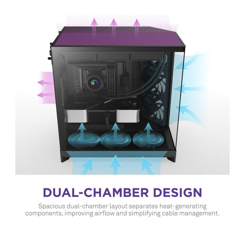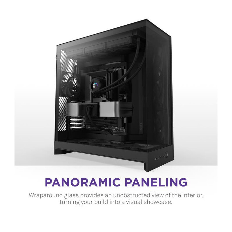 The H9 Flow is a spacious, dual-chamber case built for high-performance builds, featuring extensive cooling support and wraparound glass panels for an uninterrupted view of your build.