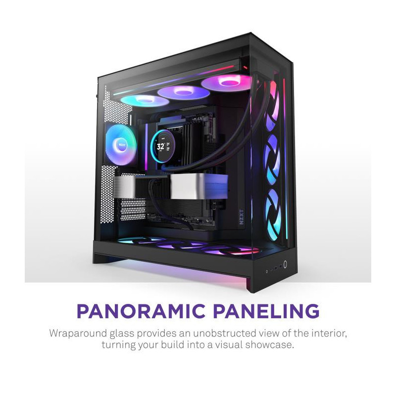 The H9 Flow is a spacious, dual-chamber case built for high-performance builds, featuring extensive cooling support and wraparound glass panels for an uninterrupted view of your build.