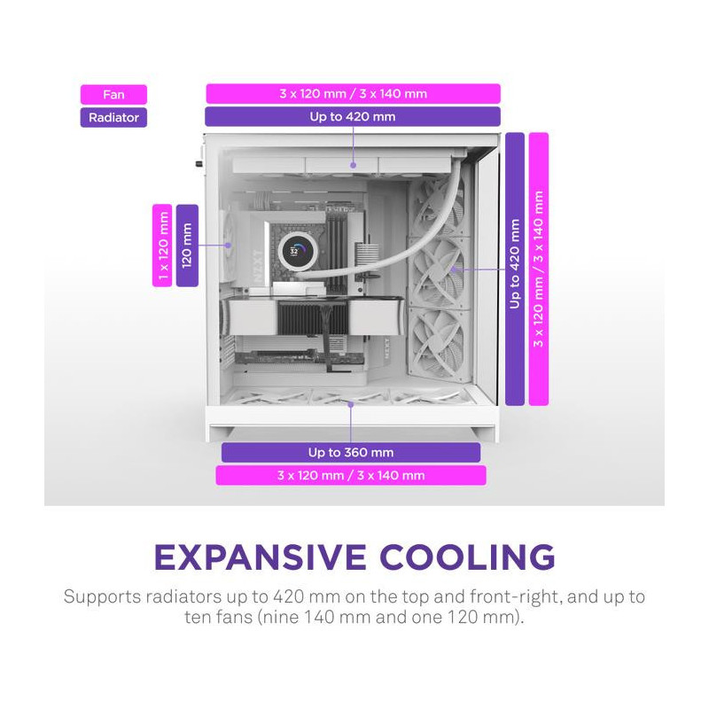 Holds up to 420 mm radiators on the top and front-right panels for versatile cooling.