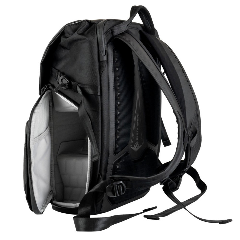 The VSGO V-BP02 Black Snipe backpack has a 16-liter capacity and two main compartments for camera equipment and accessories. It includes a padded laptop/tablet pocket, multiple external and internal pockets, and is made of weather-resistant materials.