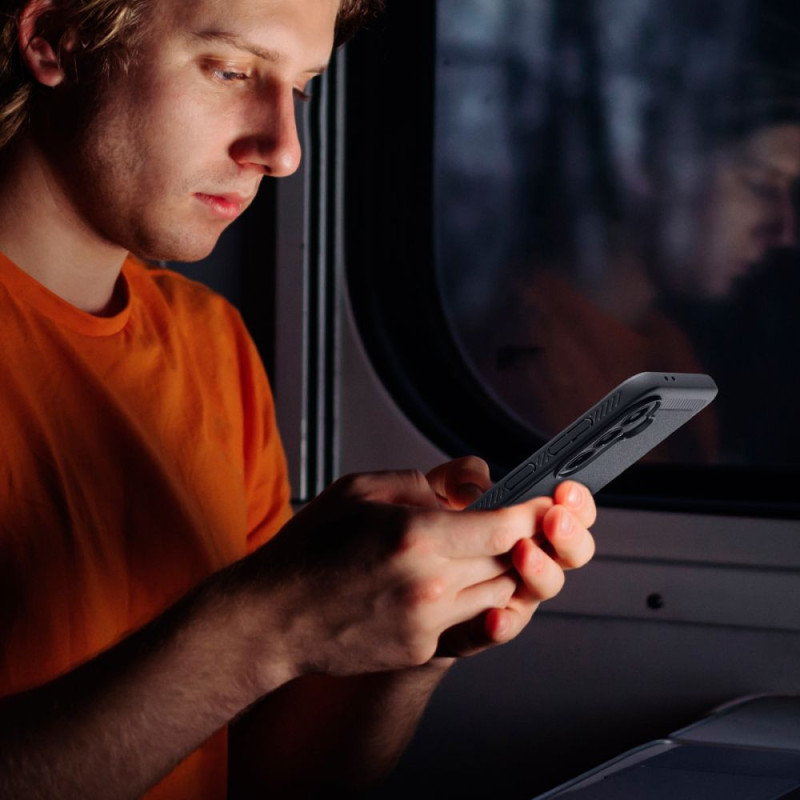 The flexible Spigen Rugged Armor case features a modern, carbon-fiber texture. Its slim design fits perfectly around the phone without altering its original silhouette.