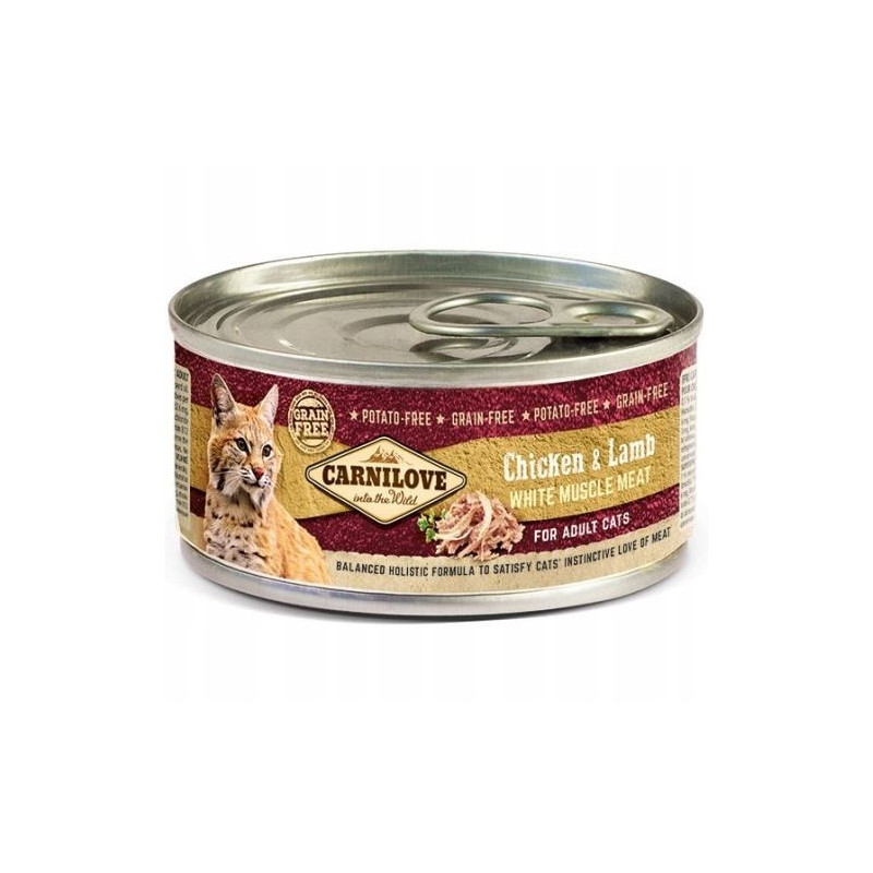 CARNILOVE Cat Chicken Lamb Muscle Meat is a gluten-free and grain-free wet food for adult cats. It comes in a 100g can and is suitable for any breed, supporting digestive health and addressing food allergies.