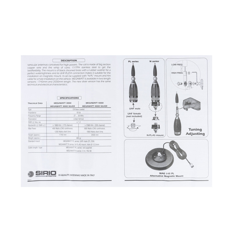 CB Antenna Sirio Megawatt 3000 PL, 173.5cm Cod 2211505.05 without cable