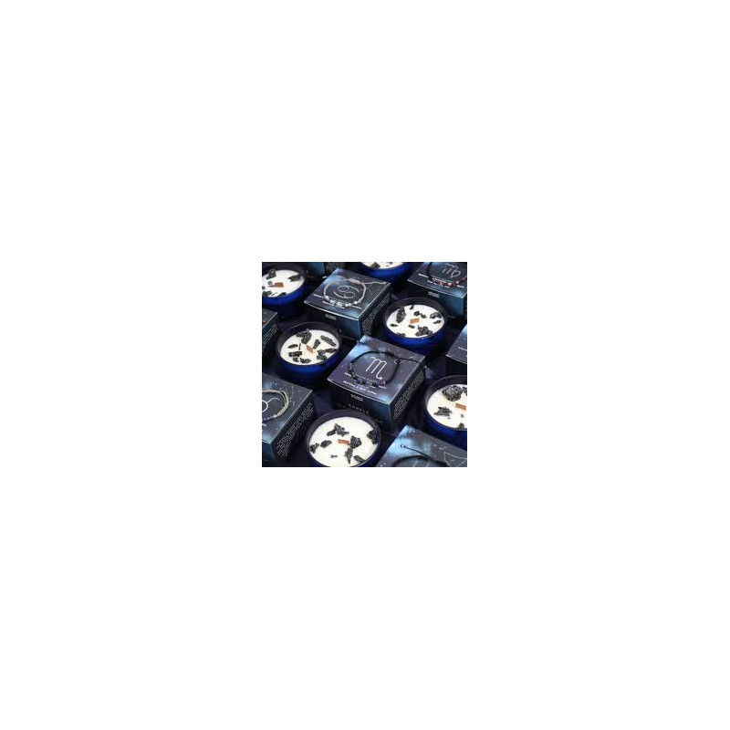 The Zodiac Crystal Candle features earthy aromas of emerald and patchouli, promoting peace and connection with nature. The set includes a lapis lazuli and moss agate gemstone bracelet, enhancing Taurus' qualities of wisdom and growth.