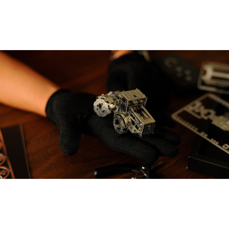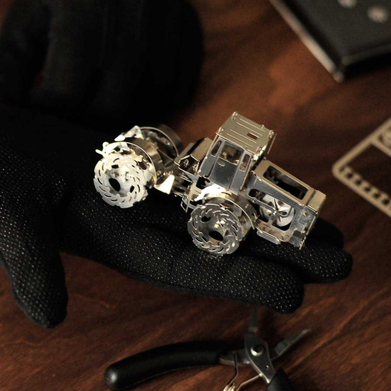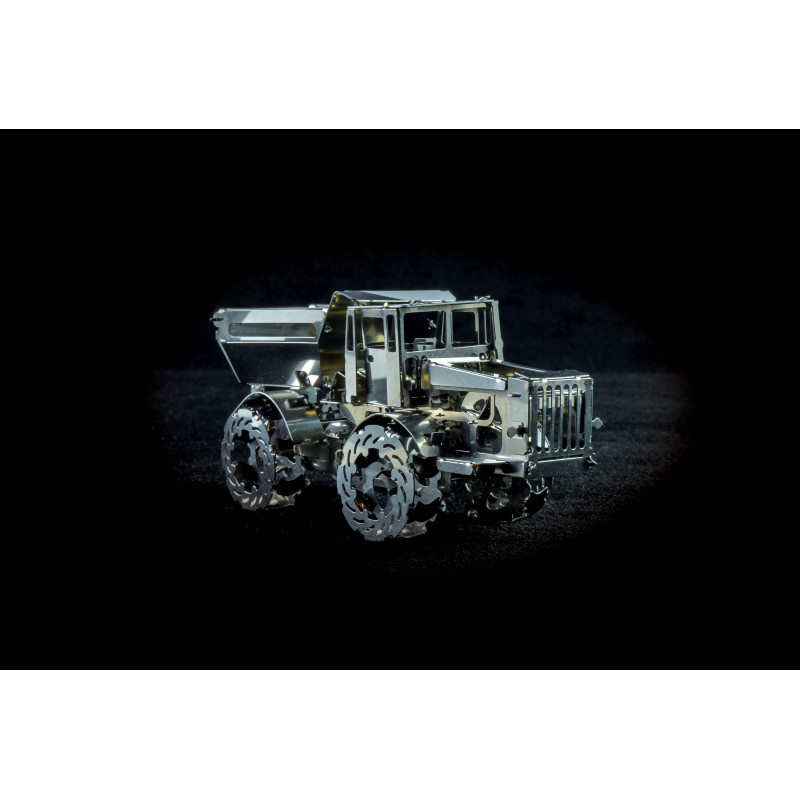 The Hot Tractor 700 model includes 3 parts plates, 4 additional drive mechanisms and assembly instructions. It features a moving rear axle, opening cab doors and is made of polished stainless steel.