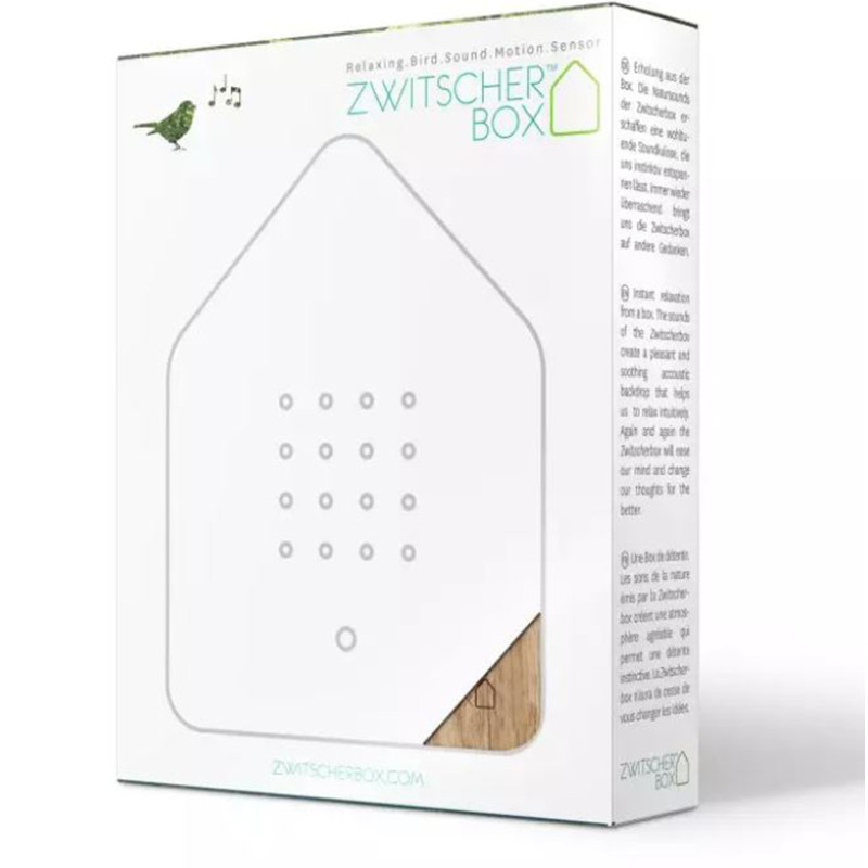 With its beautiful pattern and warm shades, this box brings nature into your home. The front part, made of oak wood, is carefully hand-crafted. Each wooden front part is a true unique specimen. The box gives you wonderful moments of relaxation. The soothing sounds of nature allow you to take a walk in the morning forest. The cheerful chirping of blackbirds and other singing birds immediately calms you down. You feel your head and body intuitively relax.