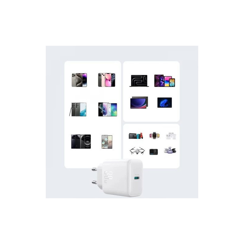 With Joyroom JR-TCF24 you can charge almost any device with a USB-C port. The charger is compatible with iPhone 15 Pro Max, Samsung Galaxy S24 Ultra, iPad Pro, Xiaomi 14 Ultra, Google Pixel, Samsung Galaxy Tab S9, Microsoft Surface GO, Nintendo Switch, Apple Watch, AirPods, GoPro and many others. It's a versatile solution that will work in any situation.