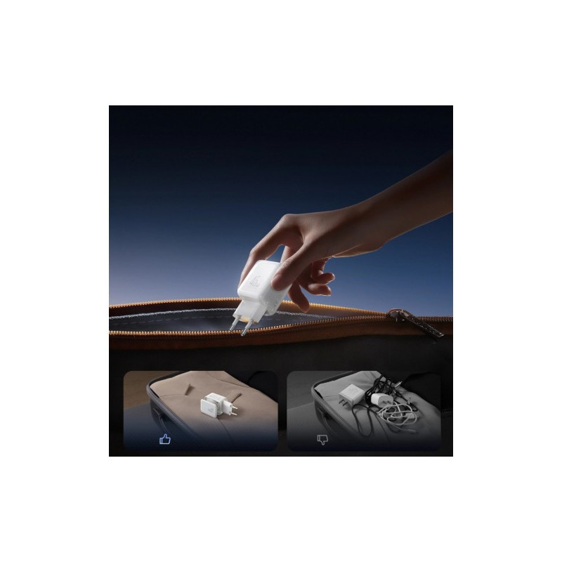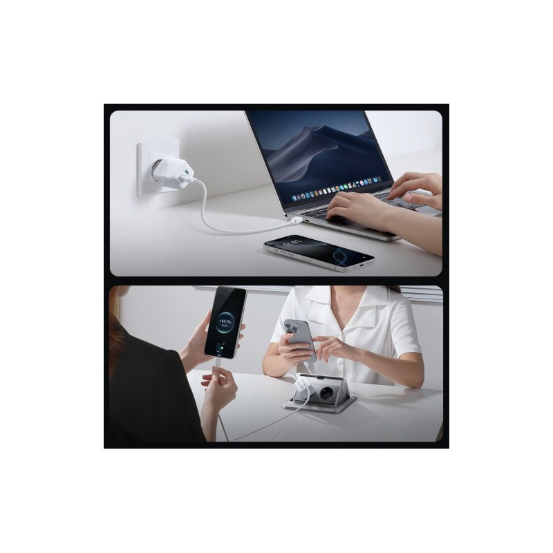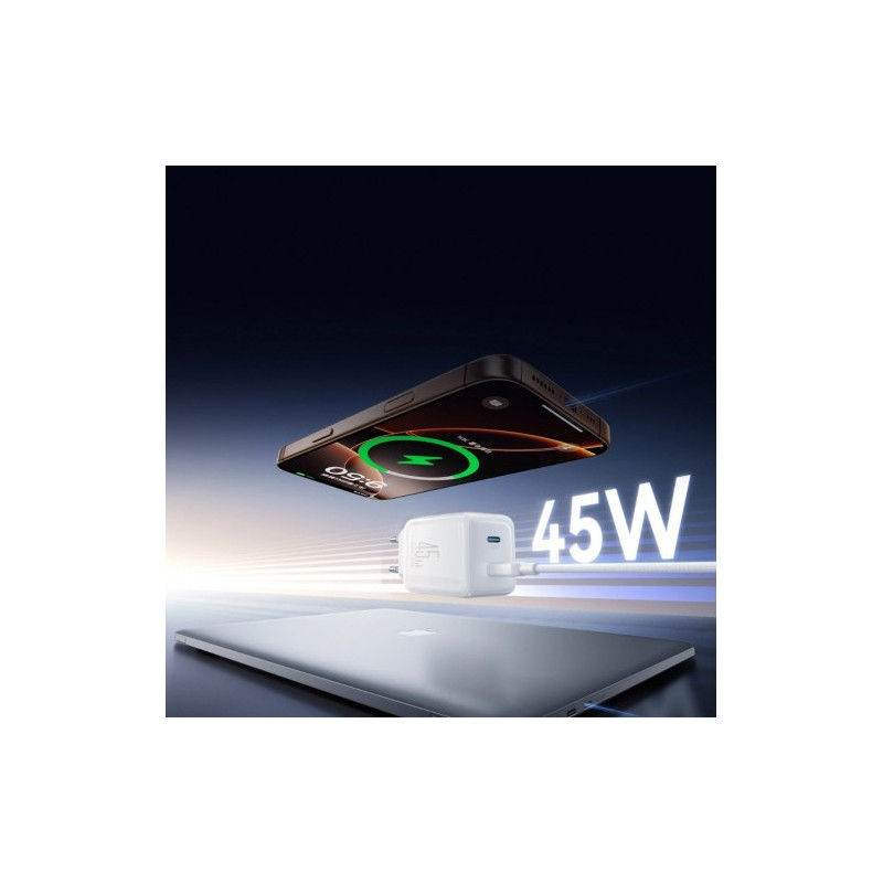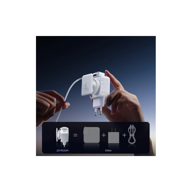 The Joyroom JR-TCL05 is a compact 45W GaN charger with two USB-C ports and cable storage. It charges a laptop up to 45W and two phones simultaneously at 30W + 15W. It supports PPS and UFCS, adapting to your device's specifications. An integrated organizer eliminates clutter and simplifies transport. A 1.2m (60W) braided USB-C to USB-C cable is included. Get a set that combines speed, organization, and portability.