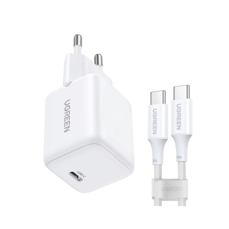 UGREEN X513 is a 30W USB-C power adapter designed for fast charging of mobile phones. It comes with a 1-meter USB-C cable and operates at 100-240V.