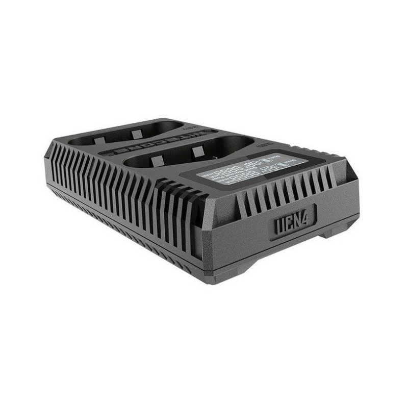The Nitecore UCN4 Pro USB camera charger allows you to charge two Canon LP E4 and LP E4N batteries simultaneously. It features an integrated USB cable, an LCD display for monitoring battery status, and reverse polarity and short circuit protection.