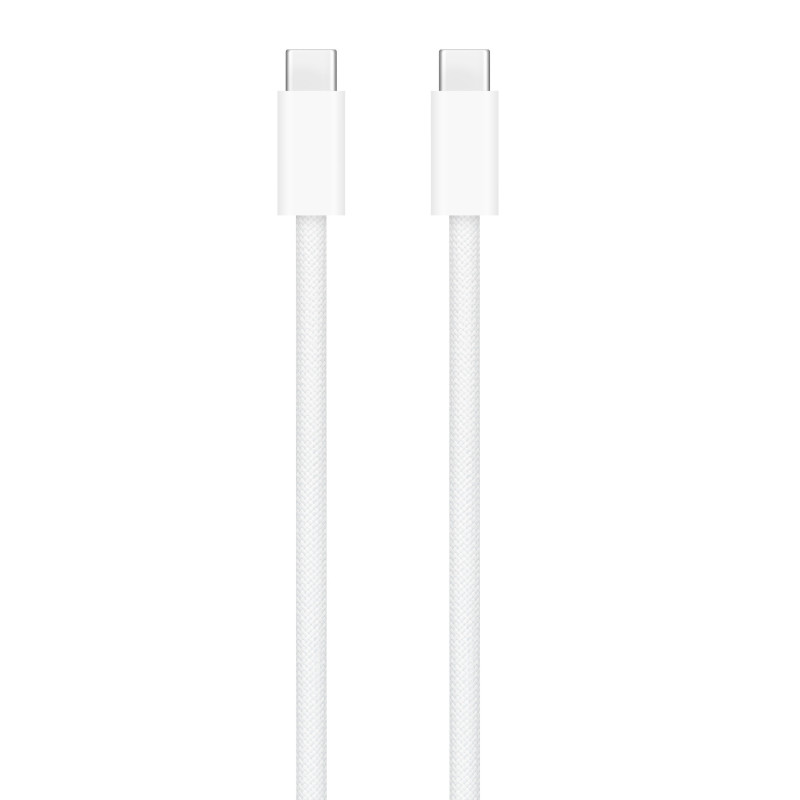 The Apple 240W USB-C Charging Cable is 2 meters long, has USB-C connectors on both ends, and supports fast charging up to 240 watts. Data is transferred at USB 2.0 speeds of up to 480 Mbps. The cable is made of durable braided material.