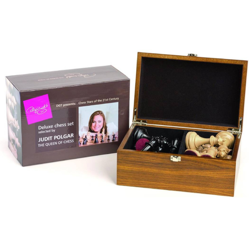 The Judit Polgar Deluxe Wooden Chess Set includes 32 pieces made of high-quality boxwood, the king height is 95 mm. The set comes in a luxurious wooden case with two additional queens for each color.