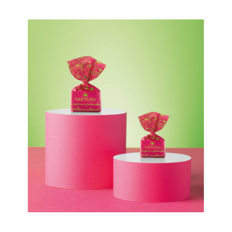 A bold and successful combination of two flavors, which was achieved thanks to the century-old experience of the Antica Torroneria Piemontese producers. In the sweet truffle you can feel how the classic pistachio and fruity raspberry flavors merge together
