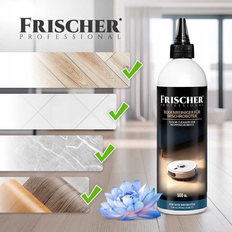Frischer liquid for robot mops is a 0.5L concentrate designed for use with robot mops. The product is supplied in a plastic bottle with an applicator and has safety warnings for proper use.