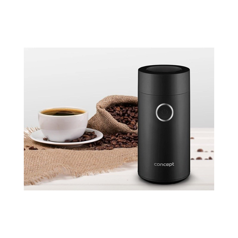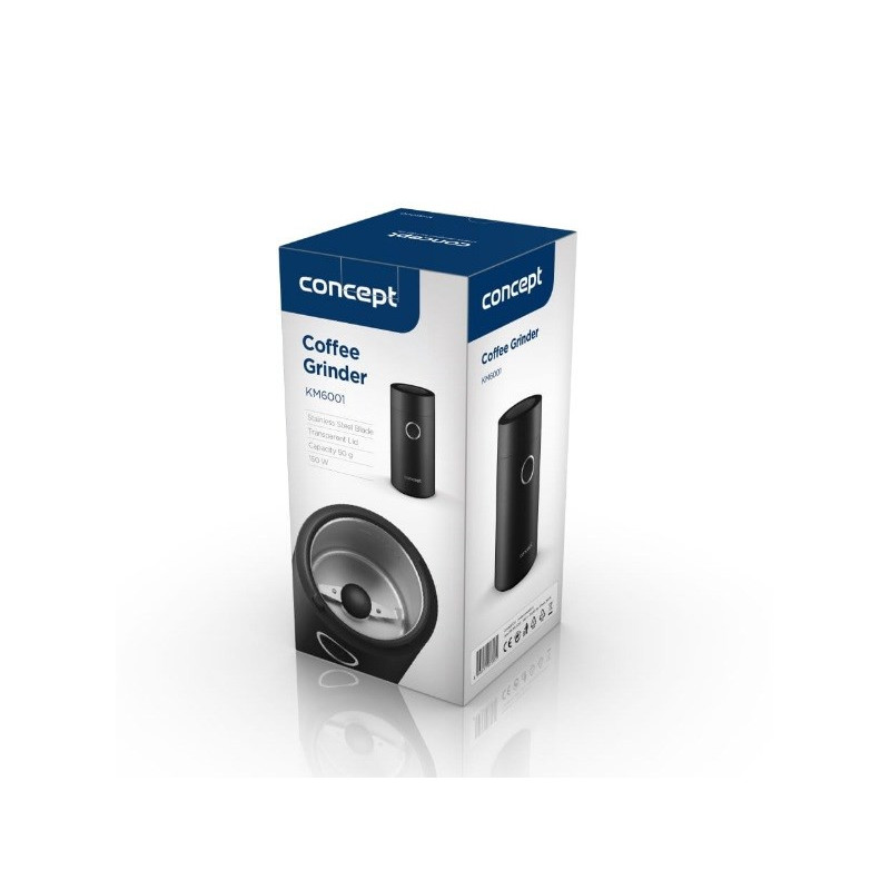 The Concept KM6001 coffee grinder has a 50g capacity and a double-sided stainless steel blade. It operates at 150W, with a noise level of 85dB and can operate from 6 to 30 seconds.