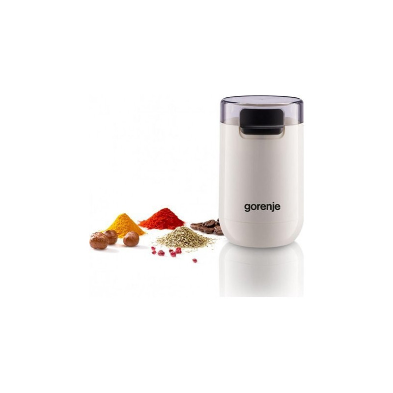 The Gorenje SMK150SW electric coffee grinder has a power of 150W and a grain capacity of 45g. It features stainless steel blades, a cord storage function and overheating protection for safe use.