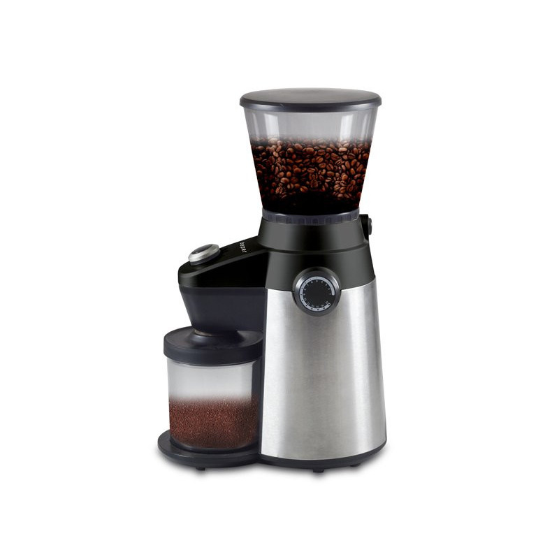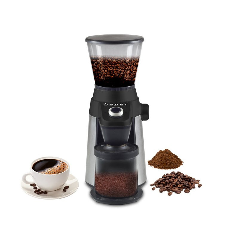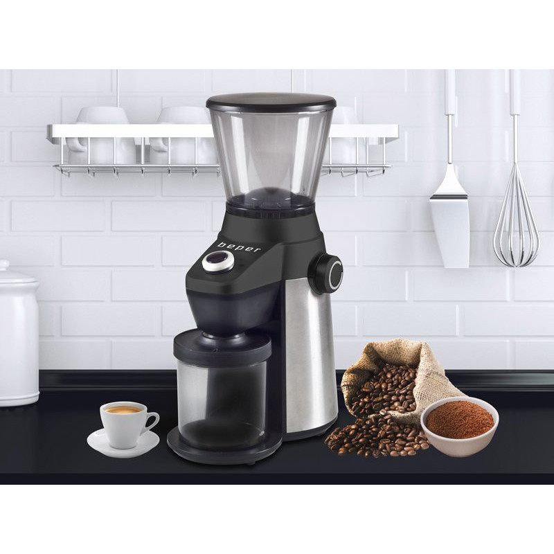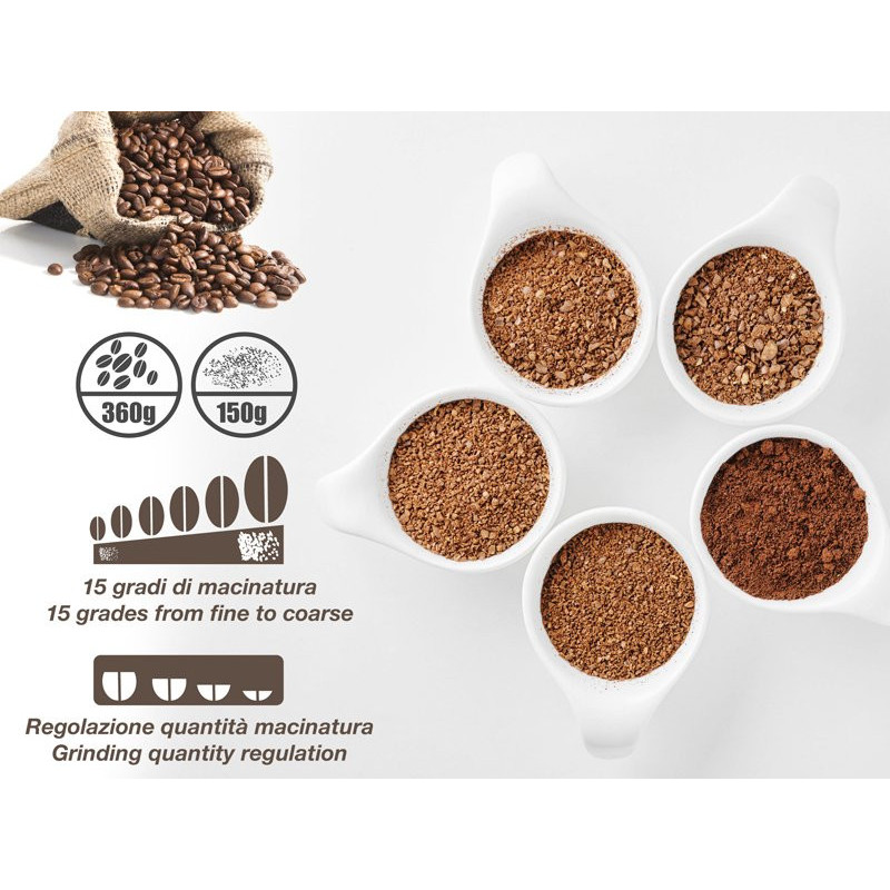 Electric coffee grinder of professional derivation with a steel body and ABS. Equipped with a precise grinding grade selector and a quantity selector for the coffee to be ground. Container with a capacity of 800ml for coffee beans and 600ml for ground coffee. Soft cleaning brush supplied and non-slip feet to ensure stability.