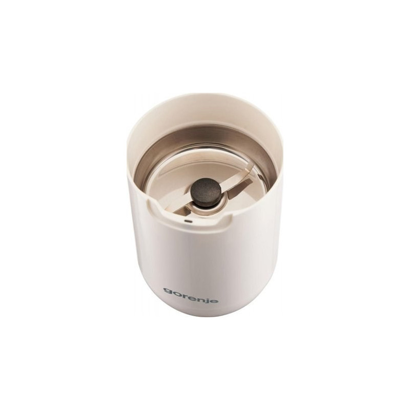 The Gorenje SMK150SW electric coffee grinder has a power of 150W and a 45g grain capacity. It features stainless steel blades, a cord storage function and overheating protection for safe use.