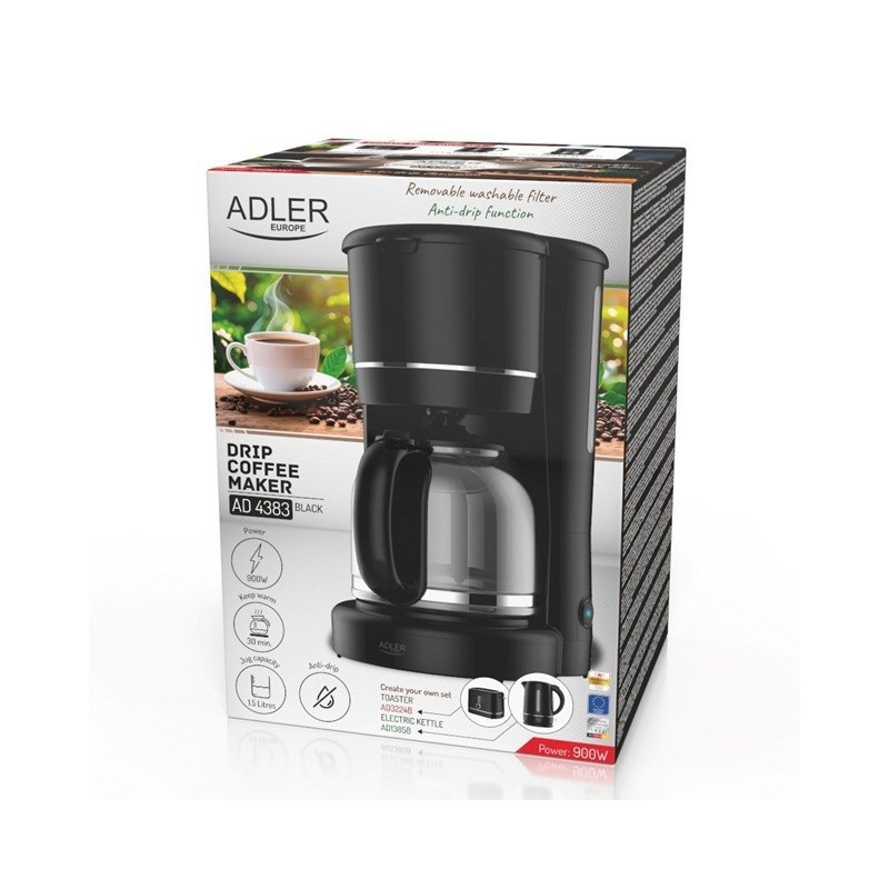 The Adler AD 4383b is a drip coffee maker designed for ground coffee beans, with a capacity of 1.5 L. It operates at 900 W and has an adjustable water volume, allowing you to adapt the coffee brewing process to your needs.