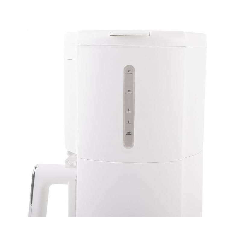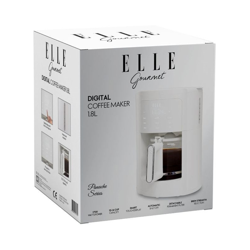 The ELLE 1.8L white filter coffee machine prepares coffee using the drip method and has a 1.8 liter jug. It features a keep warm function, a washable filter and dishwasher-safe containers for easy cleaning.