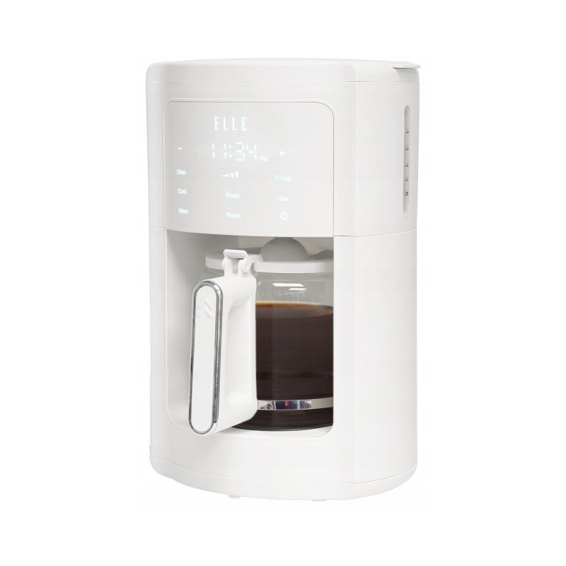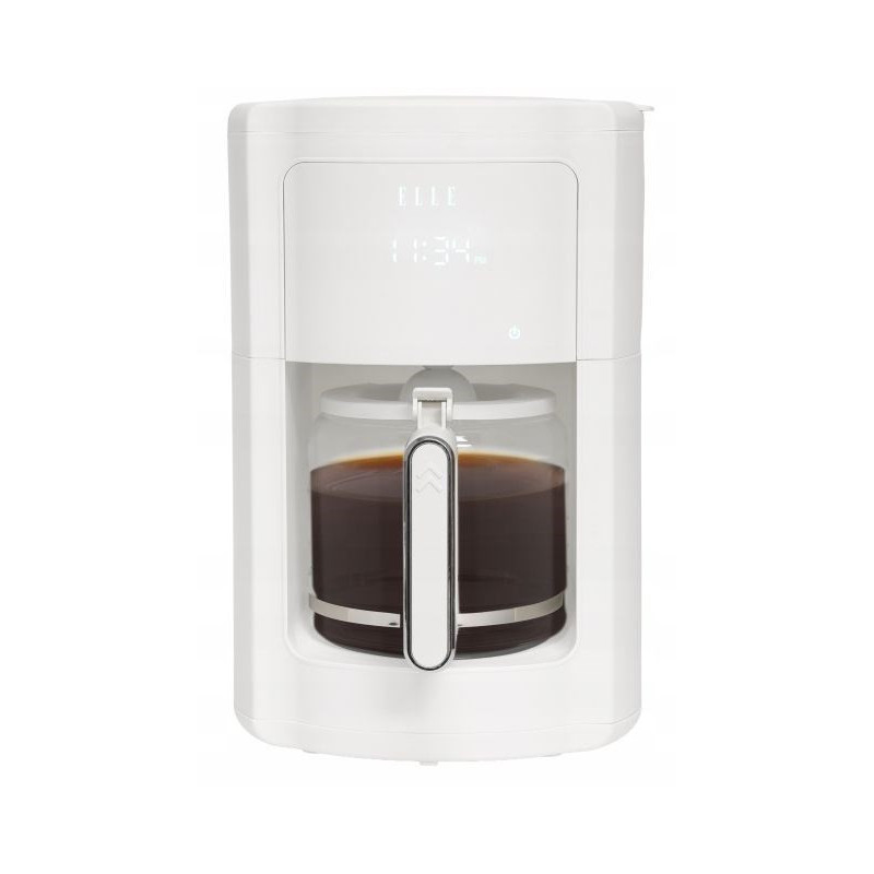 The ELLE 1.8L white drip coffee machine has a 1.8-liter jug and a keep-warm function, a washable filter and dishwasher-safe parts for easy cleaning.