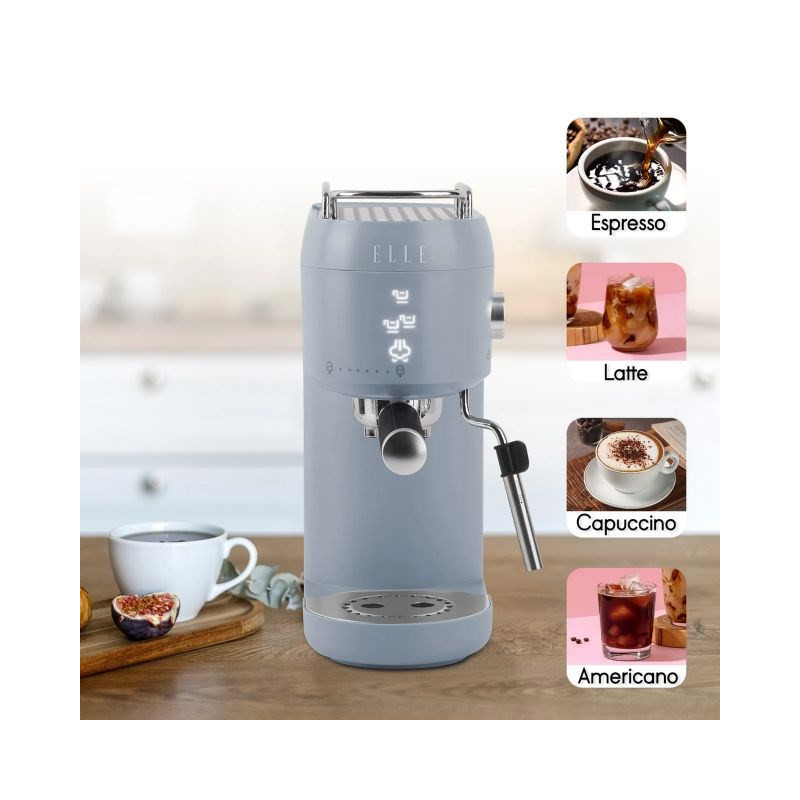 The ELLE coffee machine prepares espresso and other coffee drinks from ground coffee, and the integrated milk frother function allows you to make cappuccinos and lattes. It has a 1 liter water capacity, a maximum operating pressure of 20 bar and a touch-sensitive control screen for convenient use.