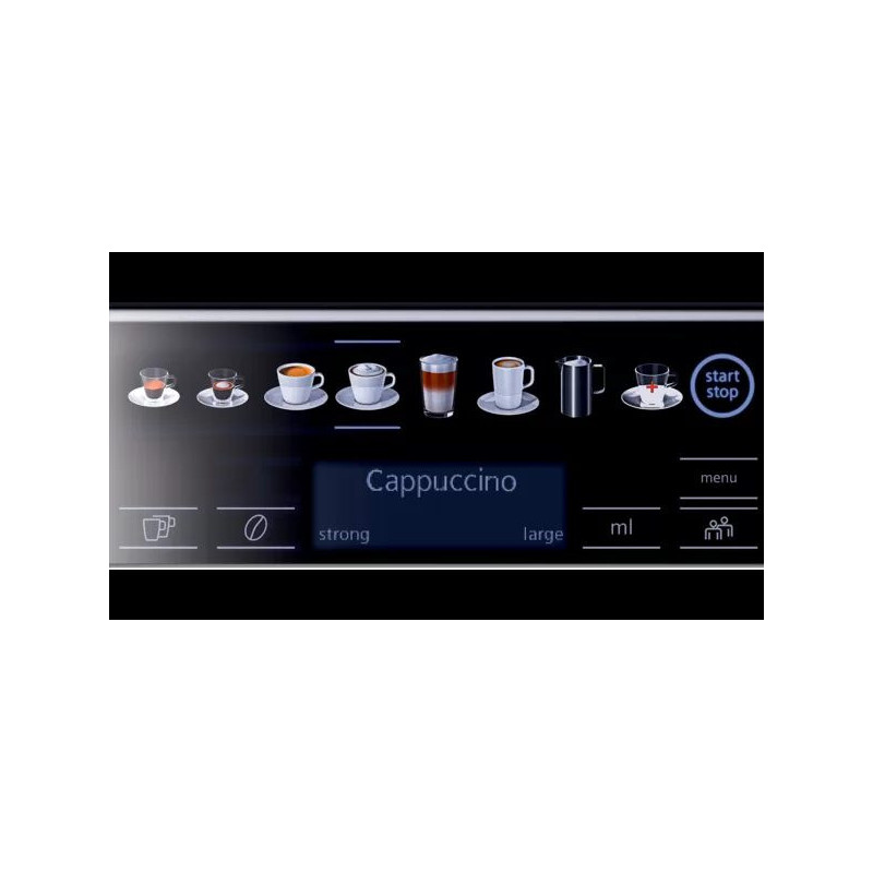 The Siemens EQ.6 TE658209RW coffee machine has a 1.7 L water tank and an integrated grinder for automatic coffee grinding. It offers several coffee preparation options, including espresso and cappuccino, with adjustable strength and temperature.