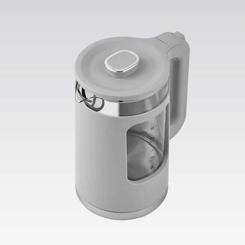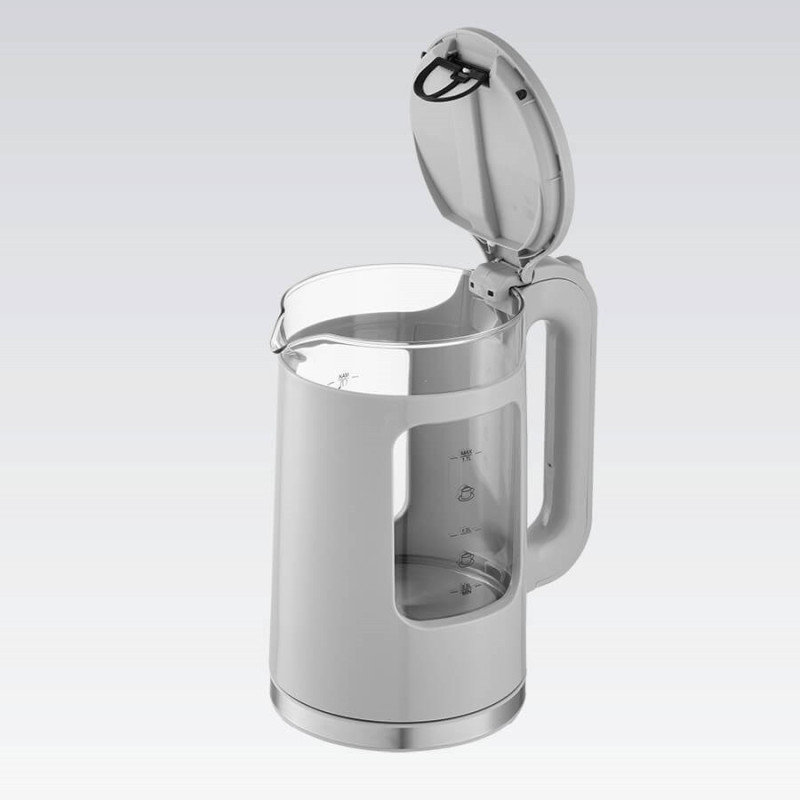 The Maestro MR-065 electric kettle has a capacity of 1.7 liters and a power of 2200 watts. It features a water level indicator, an anti-limescale filter, and a 360° rotating base for convenient use.