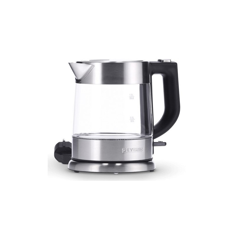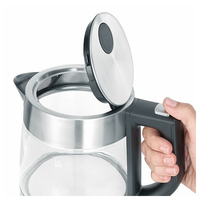 Compact kettle with a 1-liter capacity, made of glass and stainless steel. Features: 360° cordless design, easy one-handed operation and removable, washable limescale filter.