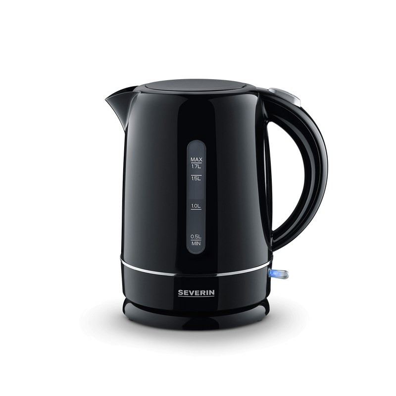 The Severin WK 4322 electric kettle has a capacity of 1.7 liters and is black in color. Its dimensions are 215 x 170 x 215 mm.