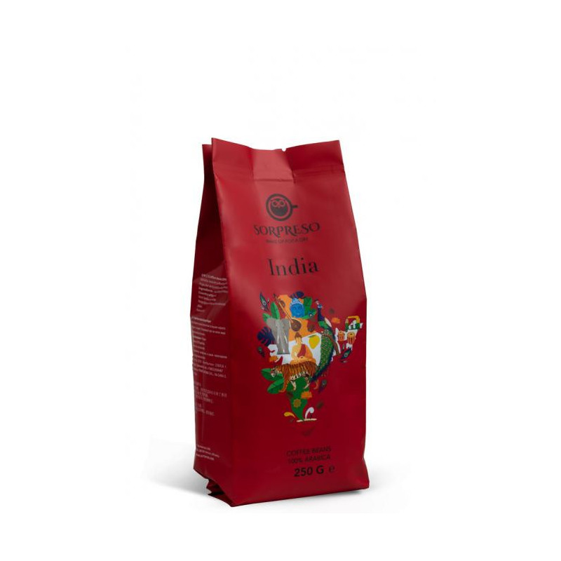 Kavos pupelės SORPRESO INDIA Plantation AA lengvai saldi su švelniu kakavos ir gvazdikėlių poskoniu kava. Pasaulyje mėgstama dėl savo žemo rūgštingumo.
