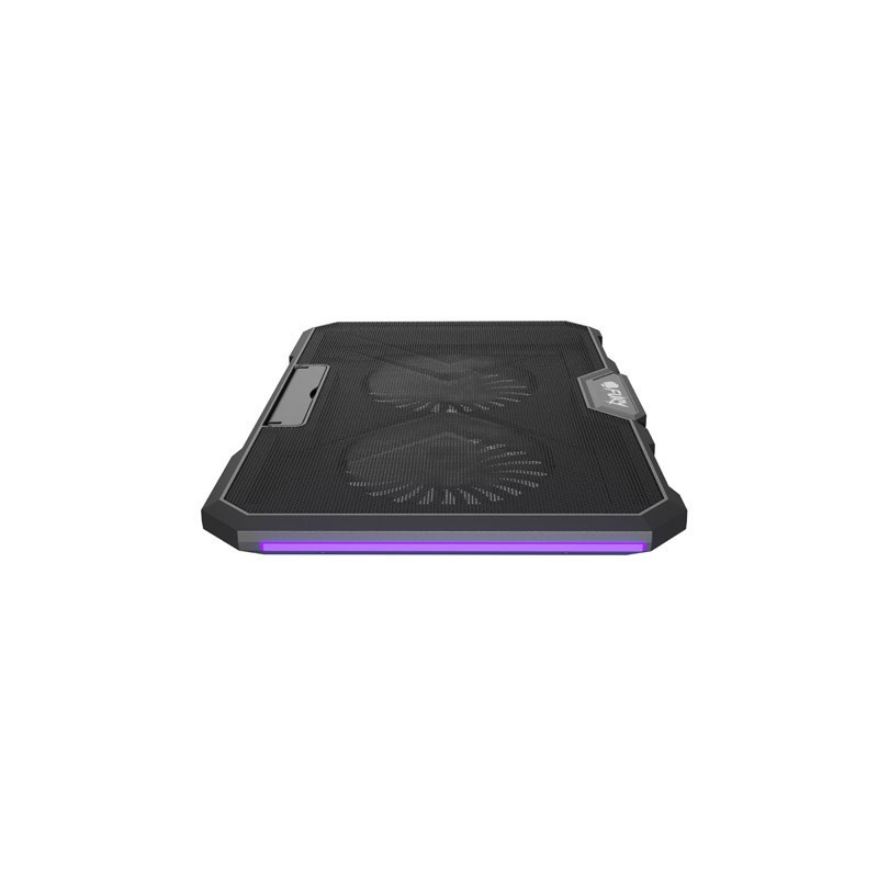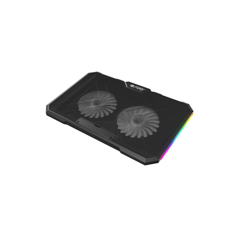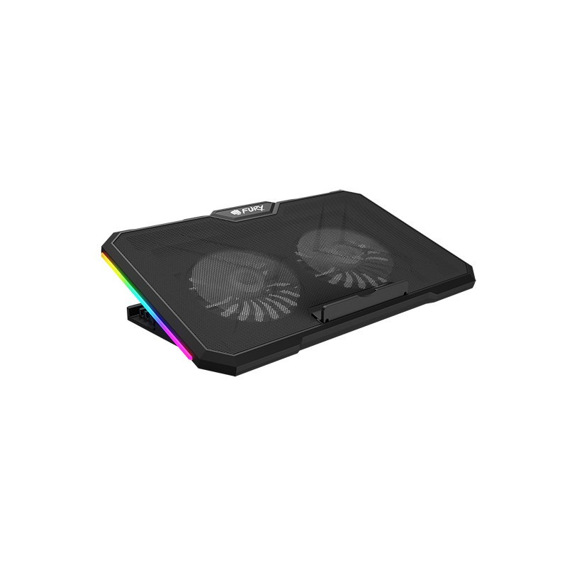 The FURY GUNBAI G3 laptop cooling pad supports 14.1-17.3-inch laptops and features two adjustable fans with a maximum speed of 880 RPM. It features RGB lighting, five levels of height adjustment, and two USB ports for power and connectivity.