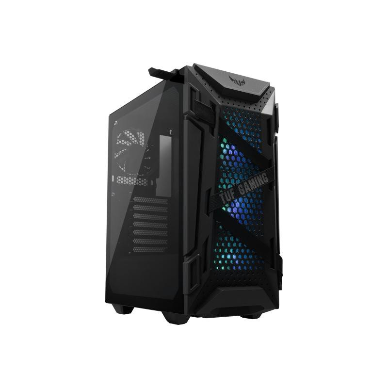 The ASUS TUF Gaming GT301 is a black ATX tower case with a perforated design for improved airflow and RGB lighting support. It can accommodate up to 4 x 2.5-inch SSDs and 2 x 3.5-inch HDDs, while easily removable dust filters ensure easy maintenance.