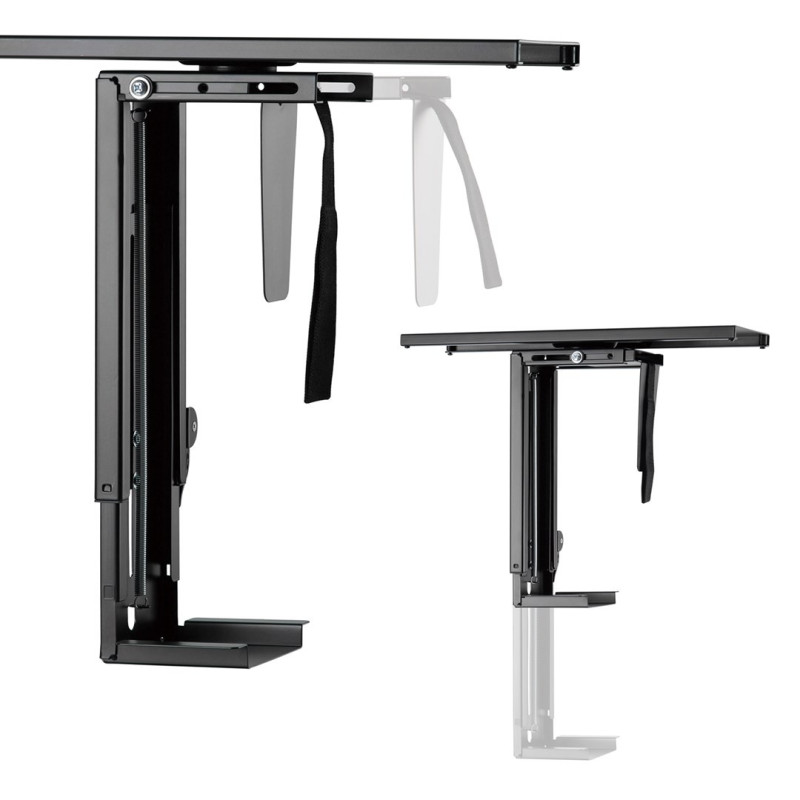 Black under desk computer holder with adjustable height and maximum weight capacity of up to 10 kg. Easy to install with the included mounting kit and clamp.