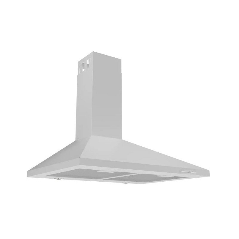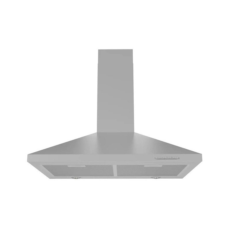 A room wall-mounted extractor hood with a stainless steel body, featuring three speeds and a maximum air extraction capacity of 345 m³/h. It operates at a noise level of 72 dB and has two LED lights for front lighting.