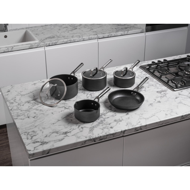 The Ninja Foodi ZEROSTICK cookware set includes five pieces: one frying pan and three pots. The pots are made of aluminum with a ceramic non-stick coating and are suitable for various stove types, with a maximum temperature of 260 °C.