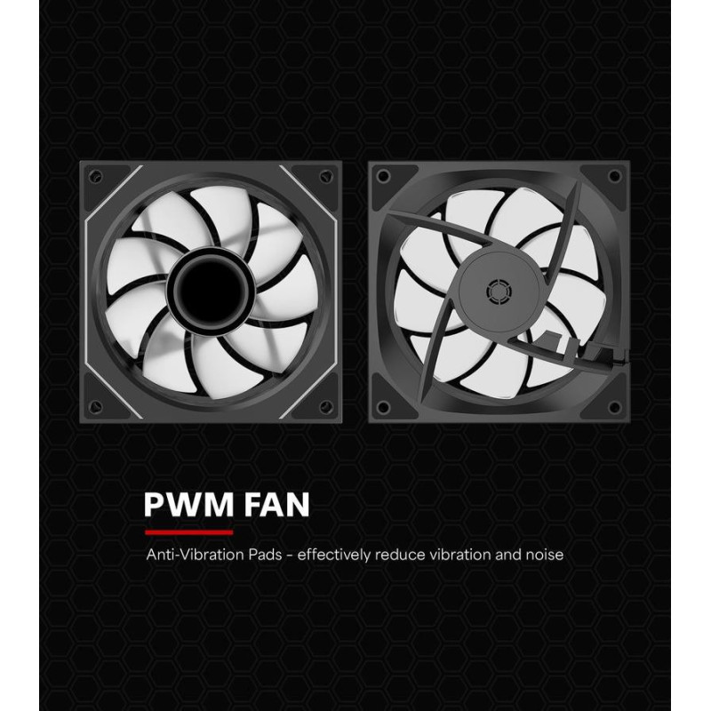 The nine-blade fan design with PWM control automatically regulates the speed between 500 and 1800 rpm, ensuring a balance between cooling performance and quiet operation.