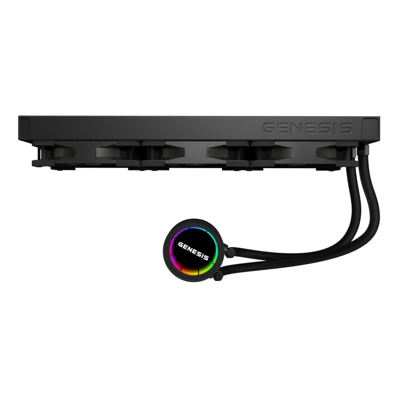 The GENESIS NLG-2320 is an all-in-one liquid cooler designed for processors. It features a black design and has three fans for efficient cooling performance.