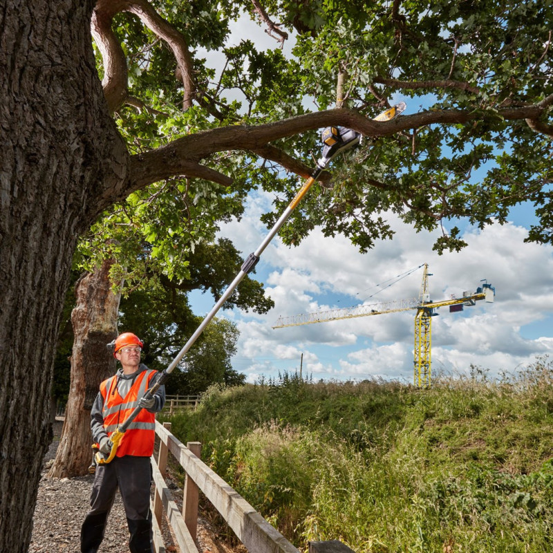 The 18V DCMPS567N-XJ chainsaw from DEWALT features a black and yellow color scheme, a 20 cm chain bar length, and a 0.115 L oil tank capacity. It runs on an 18V battery.