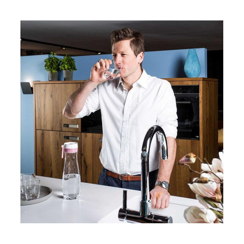 This stylish glass carafe will decorate any table at home, in meeting rooms or in the office. The large opening allows for easy and convenient filling of the carafe, including ice cubes or fruits and herbs. The shape of the carafe is pleasant to the touch, and the elegant lid with 360° spout allows for precise filling.