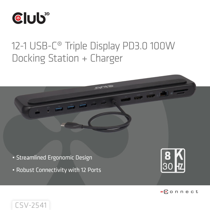 | Summary | CLUB3D CSV-2541. Connectivity technology: Docking, Host interface: USB 3.2 Gen 1 (3.1 Gen 1) Type-C, USB Power Delivery up to: 100 W. Ethernet LAN data rates: 10,100,1000 Mbit/s. Product colour: Black, Compatible memory cards: MicroSD (TransFlash), SD, HD type: 8K Ultra HD. Power source type: USB, Power connector: USB Type-C. Windows operating systems supported: Windows 10, Windows 11 |