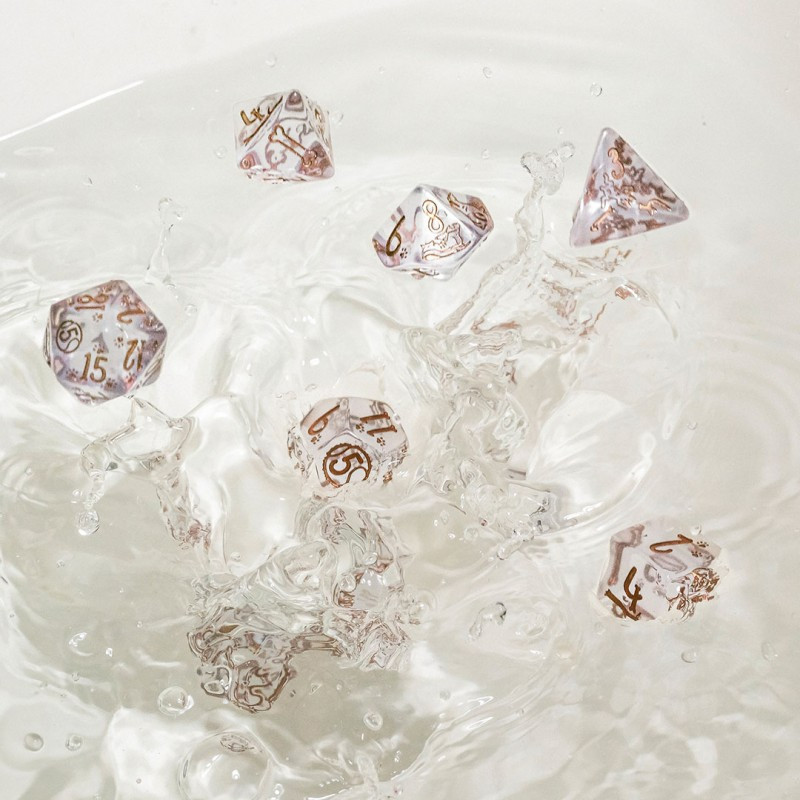 Check out the DOGS dice set: Bubbles! This design features man's best friends in various poses and their favorite toys. The gold-colored designs on a white background, mixed with glitter dust, show the unwavering elegance of our canine friends.