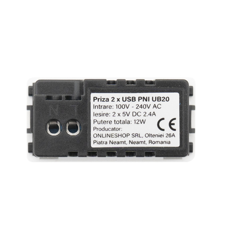 Double USB socket PNI UB20, 5V, 2.4A, modular, built-in, type F 1/2, for glass frame RM101W, RM202W