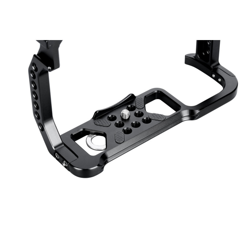 The Leofoto EOS-R5 camera cage is specially designed for the Canon EOS R5 camera, providing stability and protection while shooting. It has multiple attachment points for accessories, allowing for a variety of equipment configurations.