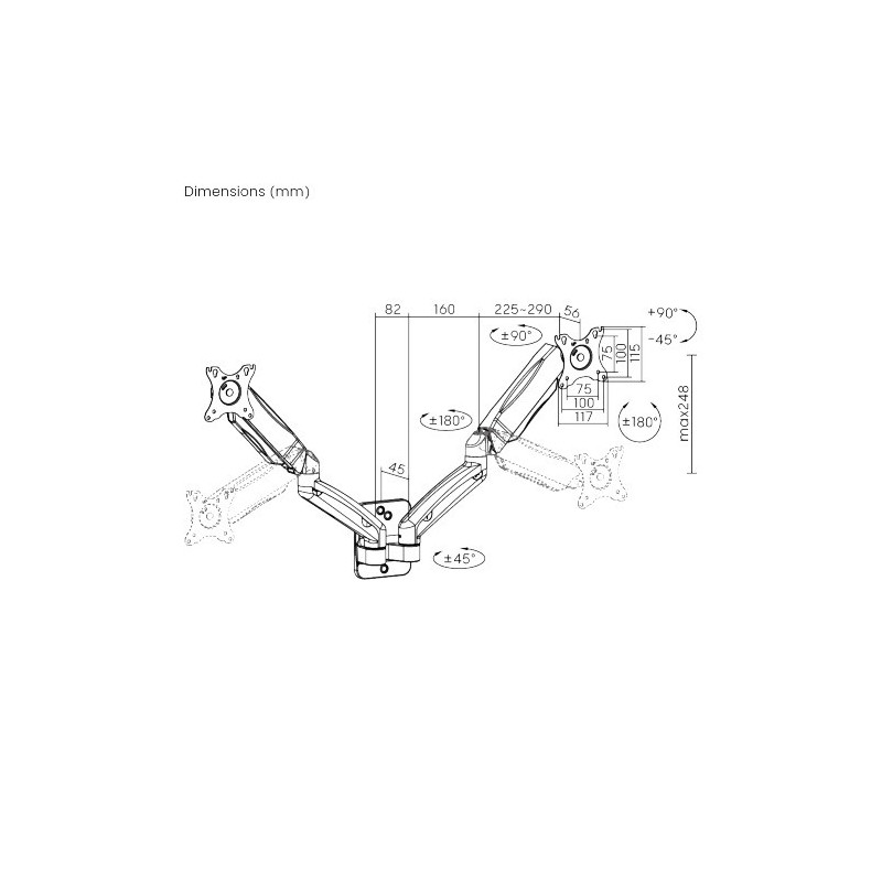 The spring-loaded stand with steel and aluminum construction holds two 17-32 inch screens weighing up to 9 kg. Designed for wall mounting. With spring-loaded handles.