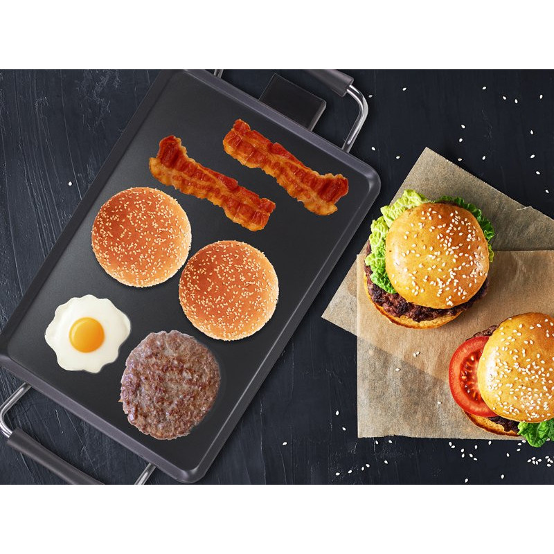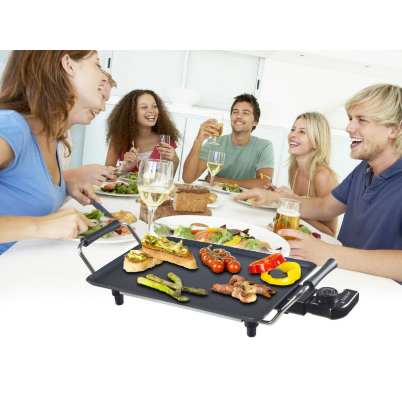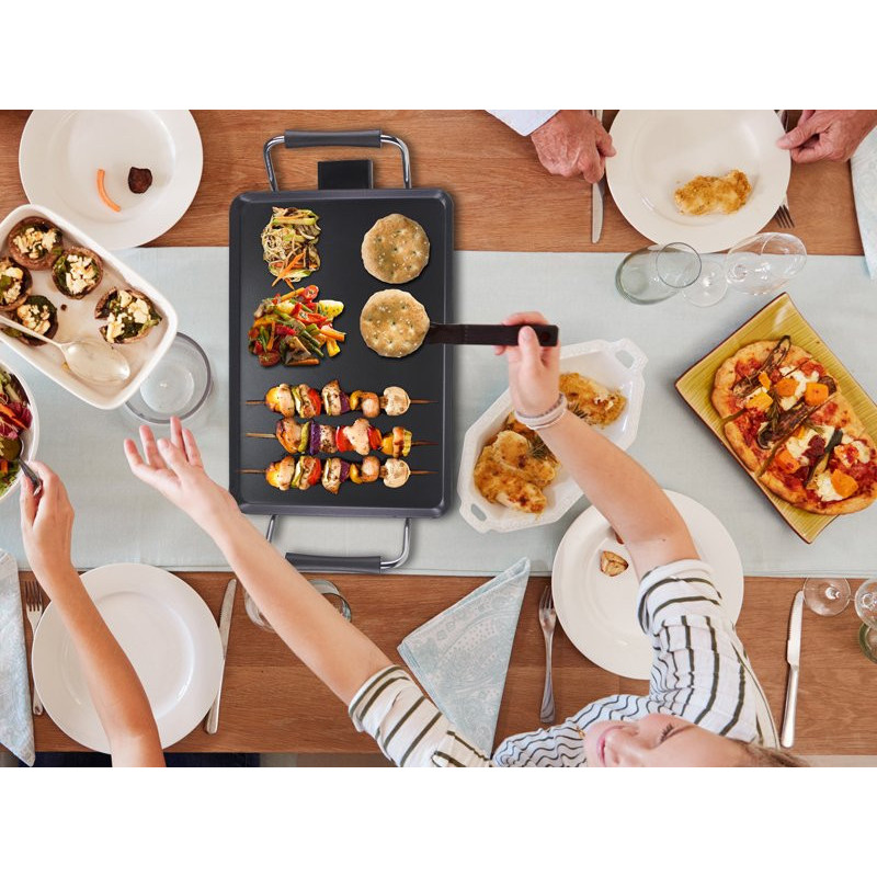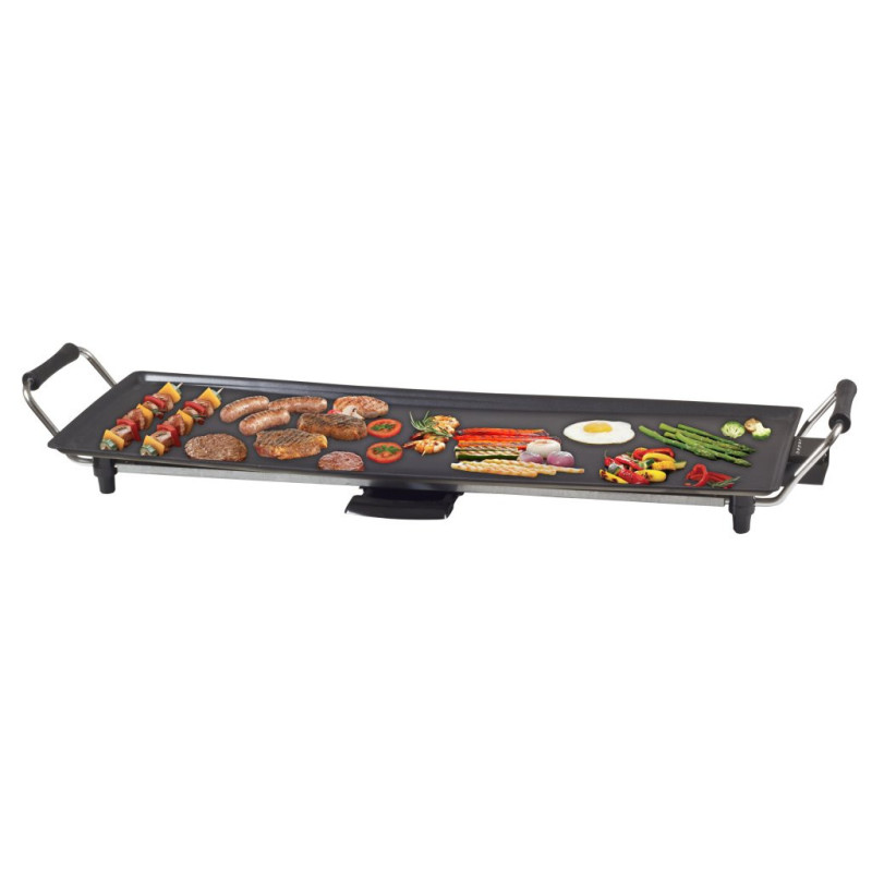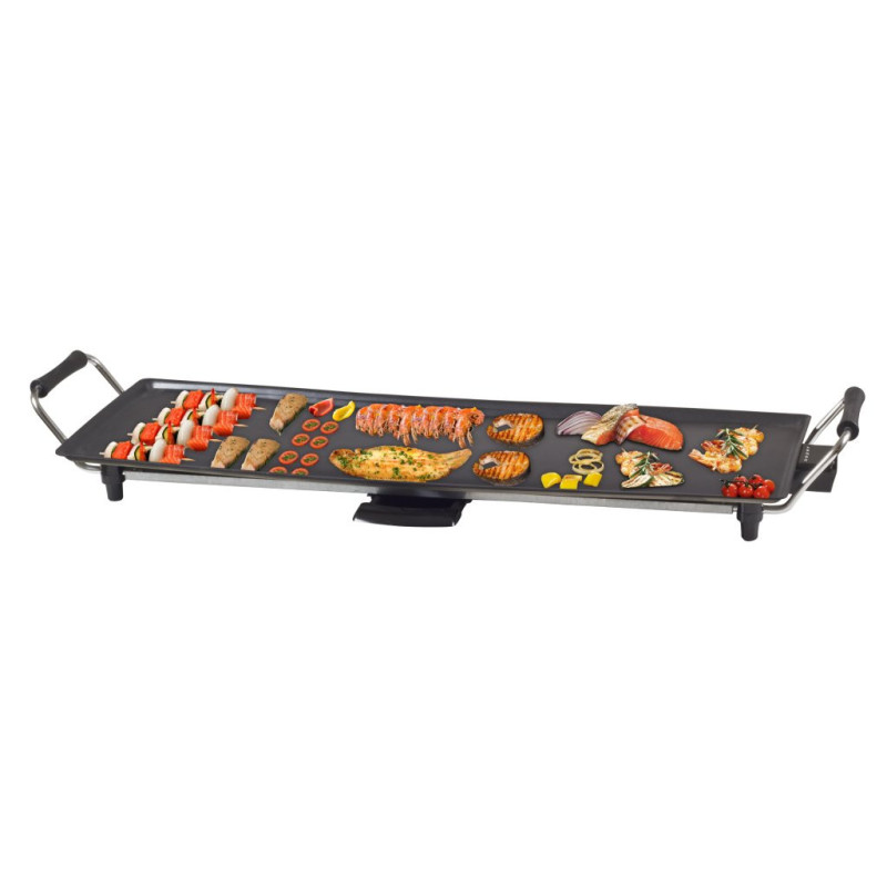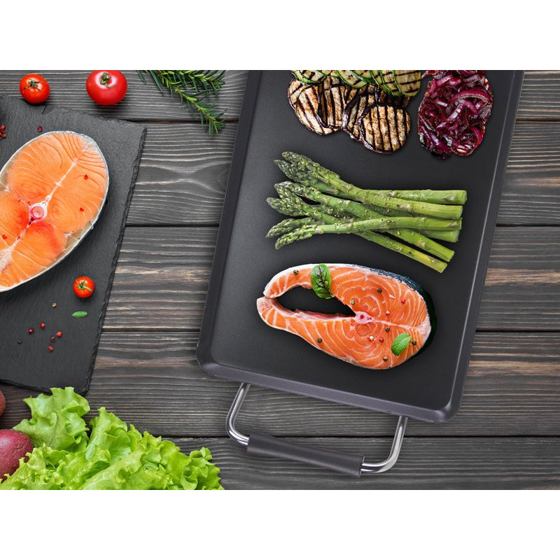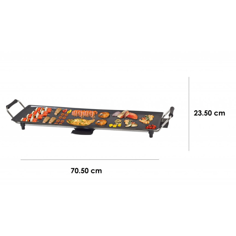 Teppanyaki plate with a surface of 70.5x23.5cm with easy-to-clean non-stick coating and cool touch handles. 5 selectable temperatures thanks to the practical removable thermostat. Complete with tray to collect grease and operating light. Ideal for cooking food naturally, without added fat and serving directly on the table.