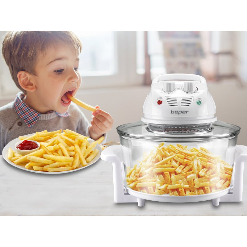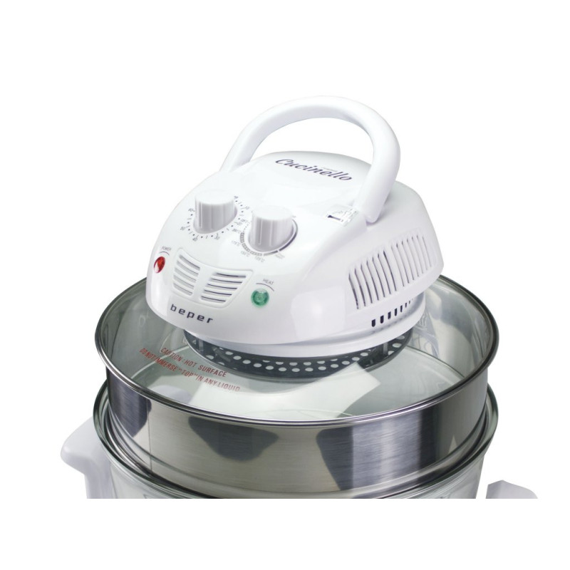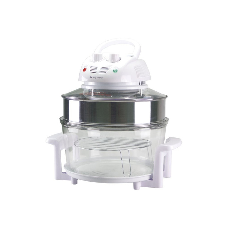 Multi-function oven with 12L glass container and steel extension ring applicable for a total capacity of 18L. Support base in ABS and glass cover with knob for setting the timer and temperature up to 250°C with red operating light and green light for reaching the temperature. Ventilated function. Low grille, high grill, grille and baking tray supplied. Easy to disassemble and clean.