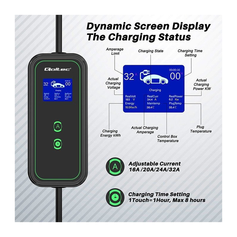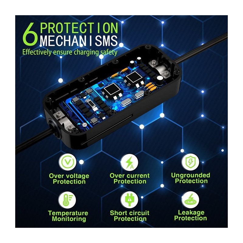 The mobile charger for electric cars supports 230V input, maximum power reaches 7kW, and the charging interface is Type 2. The device has multiple safety protection mechanisms and is IP65 rated, making it waterproof.