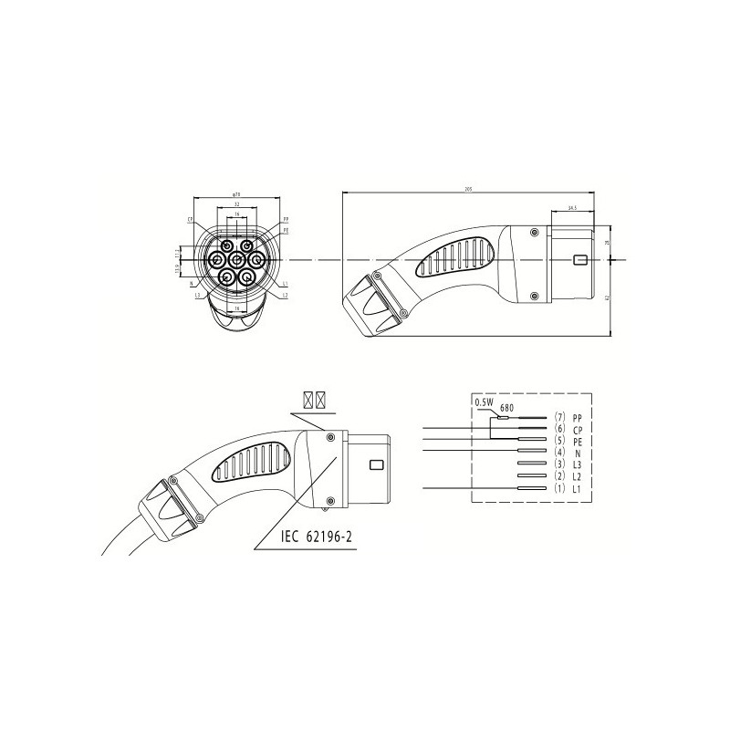 • EV connector type: IEC 62196, Type2 (European), Mennekes, 7 pins.