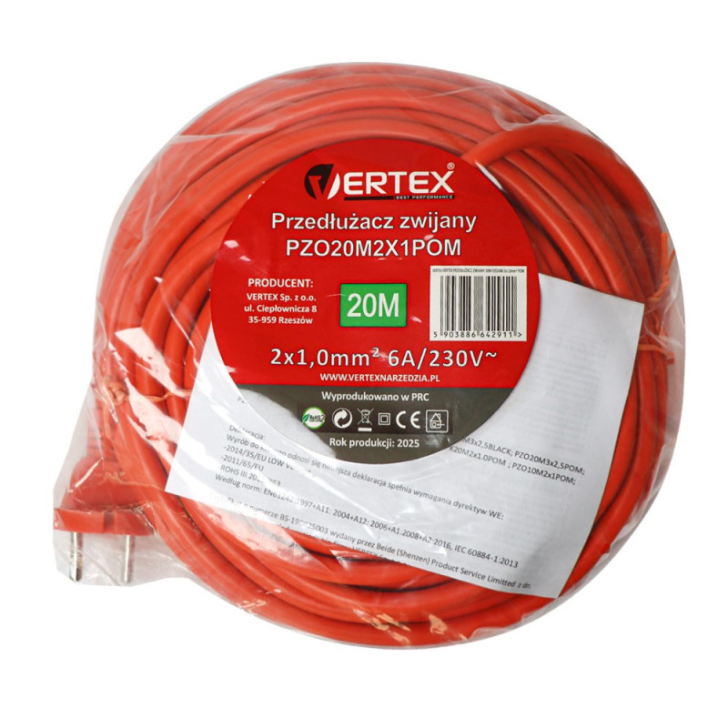 20 m retractable extension cable with 1 mm² core and IP44 protection class. Suitable for both indoor and outdoor use, has two Type E AC sockets and operates at 230 V with a maximum current of 6 A.